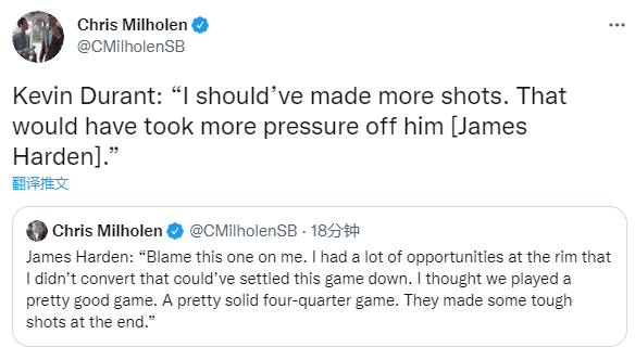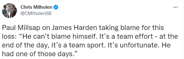 对于哈登揽责,米尔萨普表示:他不能责备自己,这是团队的努力,归根结底,这是一项团队运动,他就是经历了不走运的几天之一。