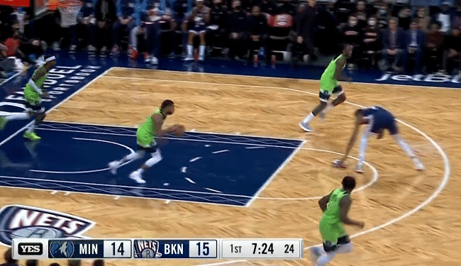这是第一节进行到7分24秒,哈登突破之后助攻杜兰特跳投命中,杜兰特投篮之后鞋子掉了。随后杜兰特上前捡起了自己的鞋子,但也直接影响到了篮网的防守,森林狼的转换进攻直接命中三分球,很显然一直在处理自己球鞋的杜兰特受到了影响。