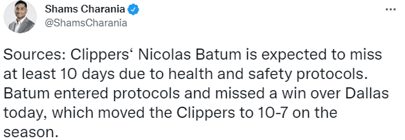 24直播网11月22日讯 ,快船和独行侠大战赛前,快船队正式宣布巴图姆因病缺席比赛,之后记者透露巴图姆触发了联盟的健康与安全协议,从而无法出战,名记则是确认巴图姆至少缺席7-10天。