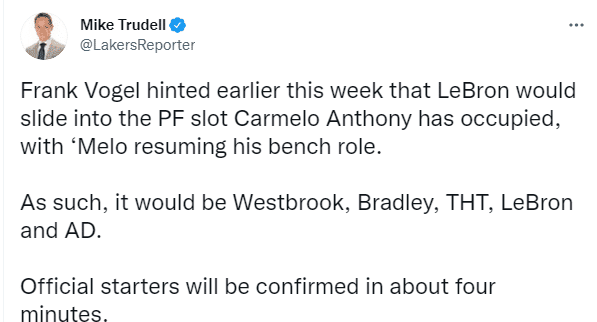 詹姆斯因腹部拉伤休养17天,期间连续缺席8场比赛,湖人仅仅拿到3胜5负的战绩;如今詹姆斯正式复出,湖人的首发阵容再次发生变化,据湖人记者透露,安东尼重回替补,詹姆斯首发出战,另外四名首发球员分别是浓眉、威少、霍顿-塔克和布拉德利,这是湖人全新首发,本赛季首次一起出战。