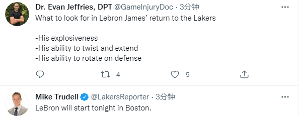 詹姆斯复出需要注意什么?医学专家Evan Jeffries表示需要注意三个方面——詹姆斯的爆发力,身体的扭动和伸展能力以及防守轮换能力;36岁詹姆斯终于复出,三巨头第7次同场竞技,希望湖人队别再有人受伤了,这个赛季的伤病太多了。