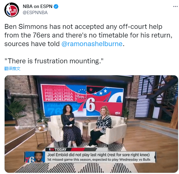 Ramona Shelburne在节目中谈到了西蒙斯的情况,她表示:(那里的)沮丧情绪越来越高,西蒙斯没有接受76人提供的任何对他的场外帮助,来让他的心态做好准备,他也没有和队友一起训练,他只是做一些单独的训练,他也没有向球队提供他的回归时间表,他的复出没有时间表。