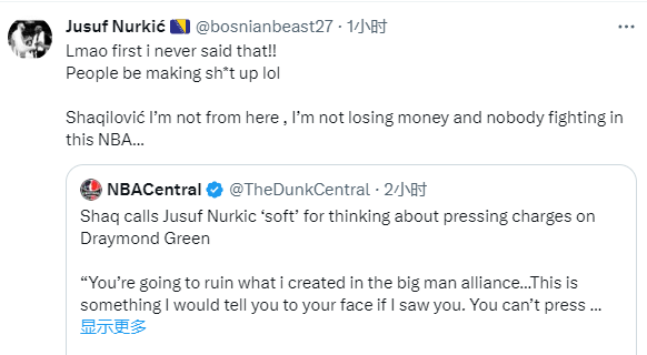 太阳中锋努尔基奇转发了奥尼尔的发言并写道:笑死,首先我从来没说过那样的话!人们在胡编乱造,笑死了。然后,我不是这种人,我不会去被罚款的,也没人来NBA是为了打架。