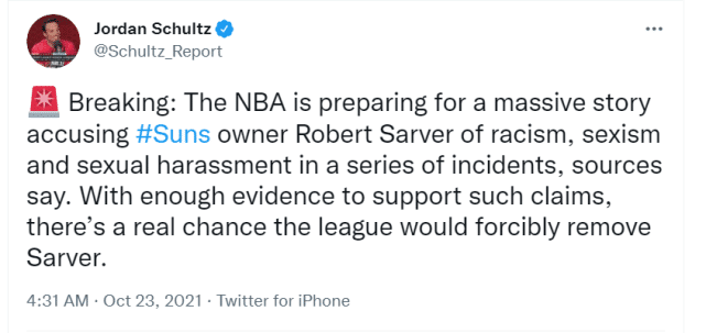 24直播网10月23日讯 ,据NBA名记Jordan Schultz报道,消息人士透露,NBA计划指控太阳队老板罗伯特-萨弗在一系列事件中存在种族主义、性别歧视和性骚扰行为。如有足够证据来支持这些指控,联盟很有可能会强制萨弗出售太阳。