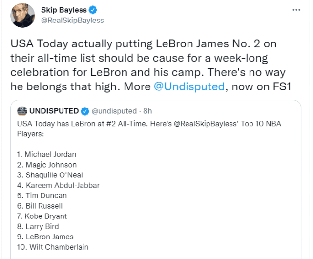 24直播网10月09日讯 ,NBA知名评论员斯基普-贝勒斯在节目上谈论《今日美国》的75大巨星排名。《今日美国》将詹姆斯排在历史第二,仅次于乔丹,而贝勒斯公布了自己心中的前十排名,詹姆斯竟然只被他放在第九。