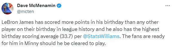 生涯至今,詹姆斯在生日夜场均能够轰下33.7分7.6篮板7助攻,投篮命中率56.3%,三分命中率43.8%,生日夜场均33.7分为NBA历史生日夜场均最高得分;一年前的今天,詹姆斯在38岁生日夜带队客场击败老鹰,全场27投18中、三分6中4狂砍47分10篮板9助攻,单场47分是詹姆斯在生日夜的第二高得分。