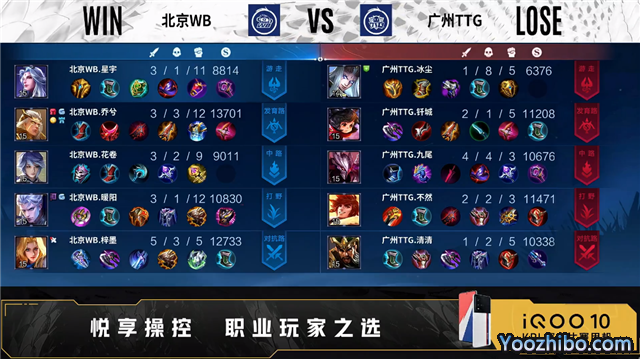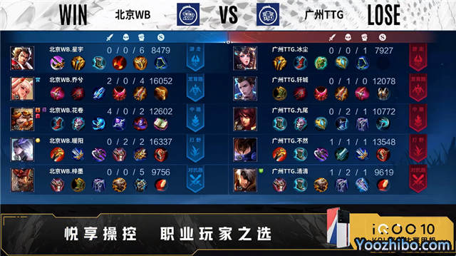 双方常规开局。3分06秒北京WB中路击杀东皇太一拿到一血。3分40秒北京WB拿下暴君。3分55秒广州TTG发育路击杀后羿。5分30秒双方对抗路1换1。5分39秒广州TTG中路击杀后羿。5分59秒广州TTG摧毁敌方发育路外塔。6分14秒广州TTG对抗路击杀夏洛特。7分35秒发育路双方1换1。8分25秒北京WB对抗路打出0换2。9分30秒中路团战北京WB打出1换2。9分59秒北京WB摧毁敌方中路外塔。10分59秒中路团战广州TTG打出2换4。12分34秒广州TTG拿下暗影主宰。13分18秒北京WB中路打出0换2。13分55秒北京WB野区击杀关羽。14分03秒北京WB摧毁敌方中路二塔。15分22秒暴君处团战北京WB击杀东皇太一,广州TTG抢到暗影暴君。16分28秒北京WB对抗路击杀干将莫邪。16分49秒北京WB摧毁敌方中路高地塔。17分14秒北京WB摧毁敌方对抗路高地塔。17分40秒北京WB强点水晶拿下比赛。
