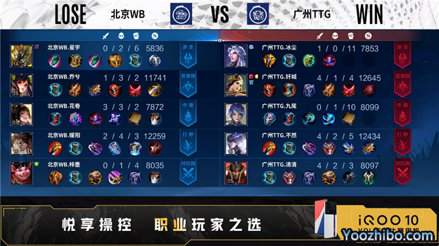 开局广州TTG入侵野区反掉蓝BUFF。2分33秒广州TTG拿下主宰。3分22秒北京WB拿下暴君。4分41秒北京WB摧毁敌方发育路外塔。5分40秒对抗路团战广州TTG打出1换2。6分24秒野区团战广州TTG打出0换2。6分48秒广州TTG摧毁敌方中路外塔。7分33秒广州TTG拿下暴君。8分04秒广州TTG野区击杀孙尚香。8分24秒北京WB中路击杀蒙恬。9分46秒北京WB对抗路击杀镜。10分43秒广州TTG拿下暗影暴君。11分18秒北京WB摧毁敌方发育路二塔。13分31秒北京WB摧毁敌方发育路高地塔,广州TTG击杀宫本武藏。14分 15秒广州TTG拿下暗影主宰。15分02秒北京WB抢到暗影暴君,团战双方2换2。15分50秒广州TTG中路打出0换2。16分27秒广州TTG打出1换4。16分33秒广州TTG摧毁敌方水晶拿下比赛。