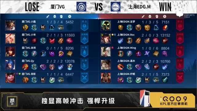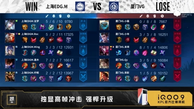 开局双方正常抢线。2分15秒厦门VG拿下暴君,发育路击杀东皇太一,拿下一血。3分46秒野区上海EDG.M澜二连击破,打出1换3。5分10秒上海EDG.M摧毁敌方对抗路外塔、发育路外塔,对抗路击杀宫本武藏。6分55秒对抗路上海EDG.M击杀宫本武藏,打出0换1。8分13秒中路团战厦门VG击杀弈星,野区上海EDG.M澜二连击破,打出1换2,拿下主宰。10分04秒野区团战上海EDG.M打出1换2,摧毁敌方对抗路外塔、中路外塔。10分56秒上海EDG.M拿下暗影主宰。12分19秒上海EDG.M摧毁敌方发育路二塔、中路二塔,高地团战双方打出1换1。13分25秒厦门VG拿下暗影暴君,野区击杀戈娅,打出0换2。14分15秒厦门VG摧毁敌方中路外塔、对抗路外塔。15分44秒野区团战双方打出3换3,厦门VG拿下暗影主宰。18分35秒中路团战双方打出3换3,厦门VG拿下暗影暴君。22分22秒野区上海EDG.M戈娅二连击破,打出2换5,团灭对手摧毁水晶拿下比赛。