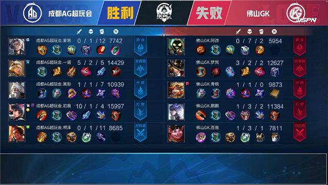 1分04秒成都拿下中路河道之灵,3分31秒中路团成都AG曜击杀公孙离拿下一血,3分48秒成都AG拿下暴君。5分钟成都AG拆掉佛山GK上路一塔,6分16秒下路团成都AG打出1换2,8分钟团战佛山GK打出0换2。10分58秒成都AG拿下暗影暴君,12分钟成都AG拆掉佛山GK下路二塔,13分45秒佛山GK拆掉成都AG中路一塔,14分钟野区团佛山GK打出1换2。14分40秒佛山GK打出2换4拆掉成都AG上路高地,娜可露露拿下四杀,15分27秒佛山GK击杀大乔,一波拆掉成都AG水晶。
