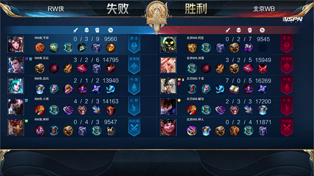 2分08秒,RW侠拿下暴君。2分22秒,RW侠嬴政击杀大乔拿下一血。3分30秒,北京WB拿下先知主宰。6分23秒,下路团,北京WB打出0换2。8分35秒,北京WB拿下先知主宰。8分47秒,RW侠下路击杀澜,随后破掉北京WB上二塔。9分13秒,北京WB破掉RW侠上二塔。9分44秒,北京WB中路击杀廉颇。10分19秒,北京WB拿下暗影暴君。10分30秒,北京WB破掉RW侠中一塔。10分44秒,RW侠破掉北京WB上二塔。11分08秒,北京WB击杀廉颇。11分21秒,RW侠下路击杀澜。12分17秒,北京WB拿下暗影主宰。11分15秒,双方团战1换1。13分37秒,RW侠野区击杀澜。14分33秒,RW侠上路击杀猪八戒。15分24秒,北京WB击杀廉颇。18分07秒,上路团,北京WB打出1换3。19分48秒,下路团,北京WB打出0换2。20分36秒,北京WB拿下风暴龙王。21分40秒,北京WB先后破掉RW侠中、上高地,但兰陵王偷掉RW侠下高地。22分02秒,北京WB一波摧毁RW侠水晶。