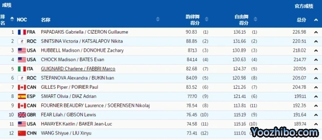 24直播网讯2月14日讯 2022年北京冬奥会在首都体育馆进入到正赛第10个比赛日的争夺,在万众瞩目的冰舞自由舞项目的比赛当中,中国组合王诗玥/柳鑫宇总成绩排名第12位,创造中国冰舞运动员在冬奥会历史上的最好成绩,平昌冬奥会亚军、世锦赛四冠王帕帕达基斯/西泽龙总成绩226.98分刷新世界纪录夺得冠军,斯尼特斯娜/卡特萨拉波夫和美国组合胡贝尔/唐诺修分别获得银牌和铜牌。