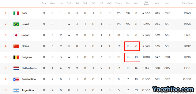 意大利8胜1负凭借局数优势,拿到小组第一。巴西女排也是8胜1负,拿到小组第二。日本女排6胜2负赢19局输8局,凭借小分优势排名小组第三,由于末轮中国比利时交锋,日本躺赢进入8强。中国女排也是6胜2负赢19局输8局,排名小组第四。比利时5胜3负赢18局输10局,排名小组第五。