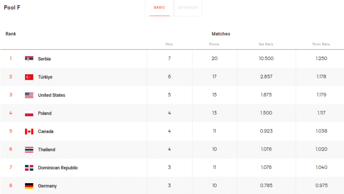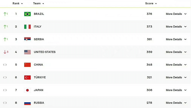 波兰女排时隔12年再次战胜美国队,而美国女排吃到球队在本届世锦赛的第二场败仗,同时因为惨败使得世界排名的积分下降,排名也下滑。美国队0-3不敌波兰队,丢了19分,世界排名从第一直接暴跌至第四,本届世锦赛有不俗表现的巴西女排以376分来到榜首,意大利373分和塞尔维亚361分紧随其后分列二、三位。美国队第四,中国女排继续位居第五名。
