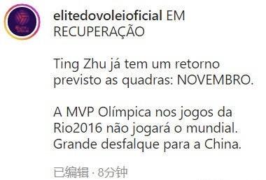 不过尽管朱婷康复情况不错,但她依然无法赶上今年女排最重要的赛事——女排世锦赛。此前朱婷曾跟随中国女排2次征战世锦赛,分别夺得亚军和季军。