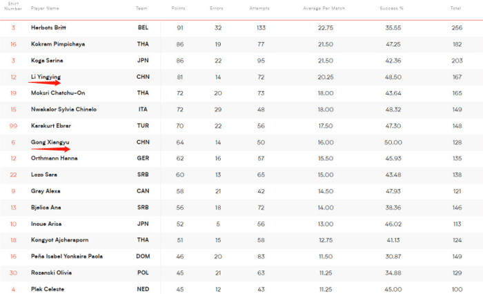 个人球员层面,得分榜上,比利时的赫伯茨以91分高居第一,名泰国女排接应平皮查亚表现强势,她和和日本女排队长古贺纱理那都是86分,位列次席。中国女排李盈莹81分排列第四,龚翔宇64分排列第8,这两人也是中国女排表现最好的球员。值得一提的是李盈莹扣球成功率48.5%,效率40.1%;龚翔宇扣球成功率50%,效率39.06%,几项数据都是名列前茅的。也期待接下来中国女排的表现。