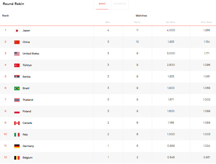 美国女排位居第三名,不会有太多人想到,这支美国女排在昨天刚刚3-0轻松击败榜首的巴西队,升至第一,但就在今天却以0-3惨败给实力不如自己的日本女排,爆出大冷门。这样美国女排最后一场比赛0分,她们的战绩虽然也是3胜1负,但积分比中国队少1分,位居第三名。