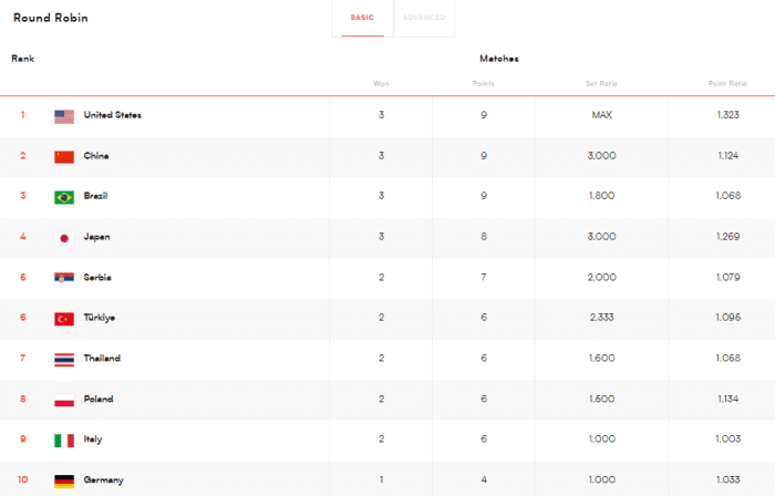 这场比赛之前,巴西队3战全胜领跑,但如今她们惨败给美国队,也从第一的位置上跌落,美国队3战全胜,目前排名第一。中国队第二名,巴西队第三名,日本队第四名,美国队、中国队和日本队都是三战全胜的状态。此前领跑的巴西和塞尔维亚均吃到赛季首败,排名下降。
