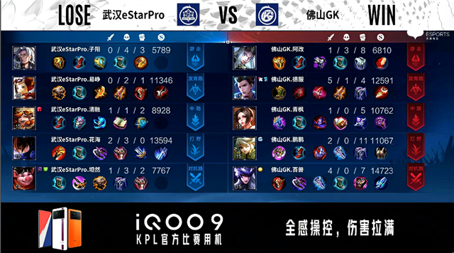 双方常规开局。1分54秒武汉eStar发育路击杀公孙离拿到一血。4分28秒发育路团战佛山GK打出1换2。6分18秒发育路团战武汉eStar击杀盾山。6分32秒武汉eStar拿下暴君。7分59秒发育路团战双方1换1。8分57秒武汉eStar拿下主宰。9分39秒佛山GK野区击杀裴擒虎。12分47秒武汉eStar拿下暗影主宰。13分11秒武汉eStar击杀嬴政并摧毁敌方中路外、二塔。13分45秒武汉eStar摧毁敌方对抗路高地塔。15分08秒武汉eStar摧毁敌方发育路高地塔,佛山GK击杀老夫子。15分52秒佛山GK拿下暗影暴君。16分31秒武汉eStar拿下暗影主宰。17分33秒对抗路团战佛山GK击杀老夫子。18分50秒高地团战佛山GK击杀老夫子。20分34秒龙王处团战武汉eStar打出1换3。21分04秒武汉eStar摧毁敌方水晶拿下比赛。