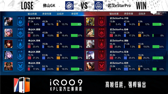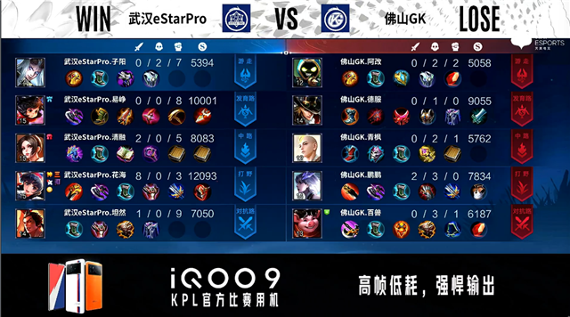 双方常规开局。2分30秒佛山GK拿下暴君。3分08秒武汉eStar对抗路打出0换2。5分05秒佛山GK发育路击杀鬼谷子。5分59秒武汉eStar暴君处击杀百里守约。6分34秒佛山GK野区击杀鬼谷子。6分52秒佛山GK野区击杀夏侯惇。7分03秒佛山GK拿下暴君。9分01秒武汉eStar主宰处击杀兰陵王。9分28秒佛山GK拿下主宰。9分58秒佛山GK摧毁敌方中路外塔。10分44秒武汉eStar拿下暗影主宰。10分53秒佛山GK拿下暗影暴君。13分07秒武汉eStar发育路击杀兰陵王。14分57秒双方对抗路1换1。15分06秒佛山GK拿下暗影主宰。16分10秒佛山GK拿下暗影暴君。17分07秒发育路团战佛山GK打出0换2并摧毁敌方发育路高地塔。16分48秒武汉eStar拿下暗影主宰。19分05秒高地团战武汉eStar打出1换5。19分47秒武汉eStar摧毁敌方水晶拿下比赛。