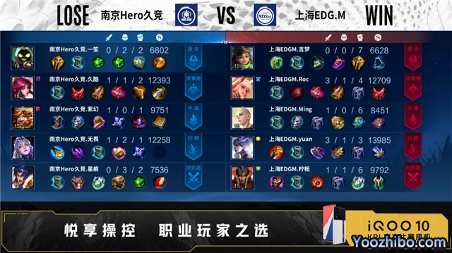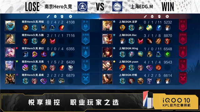 开局双方正常抢线。45秒野区上海EDG.M击杀梦奇,拿下一血。2分09秒上海EDG.M拿下暴君,野区击杀吕布,打出0换1。4分17秒上海EDG.M拿下主宰,崔康乐击杀吕布,双方打出1换1。5分42秒对抗路上海EDG.M击杀梦奇,双方打出1换1,发育路河道南京Hero久竞击杀猪八戒,中路上海EDG.M击杀鲁班大师,摧毁敌方对抗路外塔、发育路外塔,拿下暴君。8分13秒发育路南京Hero久竞击杀李元芳,野区上海EDG.M击杀吕布,双方打出1换1,上海EDG.M拿下主宰。9分22秒中路上海EDG.M击杀鲁班大师,李元芳二连击破,打出2换4,拿下暗影主宰。11分26秒野区上海EDG.M击杀黄忠,打出1换3,摧毁敌方中路外塔、二塔、高地。13分24秒上海EDG.M摧毁敌方对抗路二塔。14分06秒野区上海EDG.M击杀吕布,南京Hero久竞击杀东皇太一,打出2换3,拿下暗影主宰,摧毁敌方中路外塔。15分33秒野区上海EDG.M击杀梦奇,打出0换1。16分46秒野区上海EDG.M击杀黄忠,双方射手互换,上海EDG.M拿下暗影暴君。18分39秒野区南京Hero久竞击杀李元芳,拿下暗影主宰。19分24秒南京Hero久竞摧毁敌方对抗路二塔,击杀东皇太一,打出1换1。20分36秒野区上海EDG.M击杀黄忠,打出0换4,摧毁水晶拿下比赛。