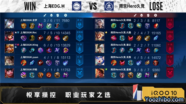 开局双方正常抢线。3分28秒南京Hero久竞拿下暴君,上海EDG.M拿下主宰。4分49秒发育路南京Hero久竞击杀蒙恬,拿下一血。6分53秒上海EDG.M摧毁敌方对抗路外塔,南京Hero久竞摧毁敌方发育路外塔。7分37秒中路上海EDG.M击杀太乙真人,打出0换2,拿下暴君,摧毁敌方发育路外塔。9分15秒南京Hero久竞拿下主宰,摧毁敌方发育路二塔。11分16秒上海EDG.M拿下暗影暴君,摧毁敌方对抗路二塔。12分40秒上海EDG.M摧毁敌方中路外塔,拿下暗影主宰。13分43秒野区上海EDG.M击杀项羽,摧毁敌方中路二塔、发育路高地。14分13秒南京Hero久竞击杀公孙离,双方打出1换1。15分33秒上海EDG.M拿下暗影暴君。16分53秒中路上海EDG.M公孙离二连击破,打出1换4,摧毁水晶拿下比赛。