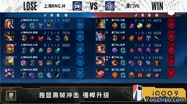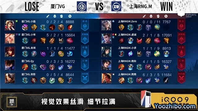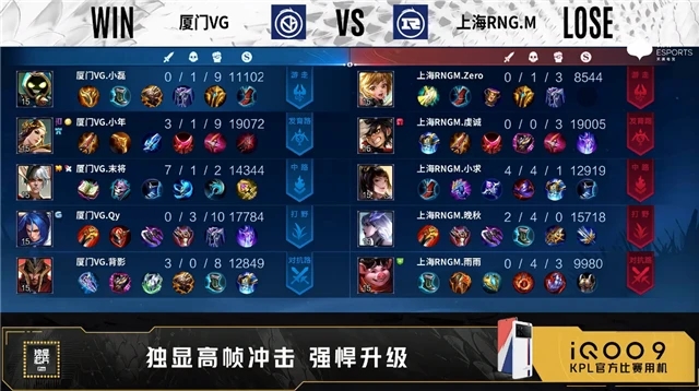 双方常规开局。2分46秒厦门VG拿下暴君。3分13秒上海RNG.M中路上河道击杀夏侯惇拿到一血。5分04秒上海RNG.M曜对抗路单杀澜。6分32秒厦门VG发育路击杀曜。7分14秒厦门VG拿下暴君。8分08秒中路上河道团战厦门VG击杀西施。9分49秒中路团战厦门VG击杀吕布。10分57秒厦门VG野区击杀吕布。12分20秒厦门VG拿下暗影主宰。12分38秒对抗路团战上海RNG.M击杀澜。14分08秒厦门VG拿下暗影暴君。15分08秒厦门VG摧毁敌方对抗路二塔。17分28秒上海RNG.M野区击杀张飞。18分50秒野区团战上海RNG.M打出1换2。20分46秒厦门VG拿下风暴龙王,团战上海RNG.M打出0换3。21分14秒上海RNG.M摧毁敌方对抗路二塔。21分39秒上海RNG.M团灭对手摧毁水晶拿下比赛。