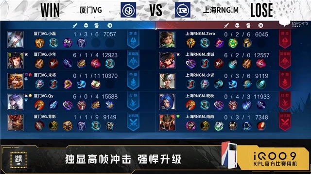 双方常规开局。2分38秒中路双方1换1。4分50秒中路下河道团战厦门VG击杀桑启。9分整厦门VG中路击杀蒙恬,上海RNG.M摧毁敌方对抗路外塔。10分15秒厦门VG拿下暴君。10分48秒厦门VG摧毁敌方对抗路二塔。11分21秒厦门VG发育路打出0换2。12分03秒厦门VG拿下暗影主宰。12分58秒厦门VG发育路击杀橘右京。13分16秒厦门VG摧毁敌方中路二塔。13分26秒厦门VG摧毁敌方发育路二塔。13分59秒厦门VG拿下暗影暴君。14分30秒对抗路团战双方2换2。14分58秒厦门VG野区击杀蒙恬。15分59秒厦门VG拿下暴君。16分56秒厦门VG打出1换2并摧毁敌方发育路高地塔。17分31秒厦门VG强点水晶拿下比赛。