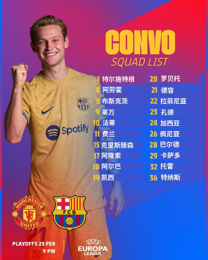 24直播网02月22日讯 ,巴塞罗那俱乐部官方公布了,欧联次回合对阵曼联名单,佩德里、登贝莱伤停,加维停赛,卡萨多入选。