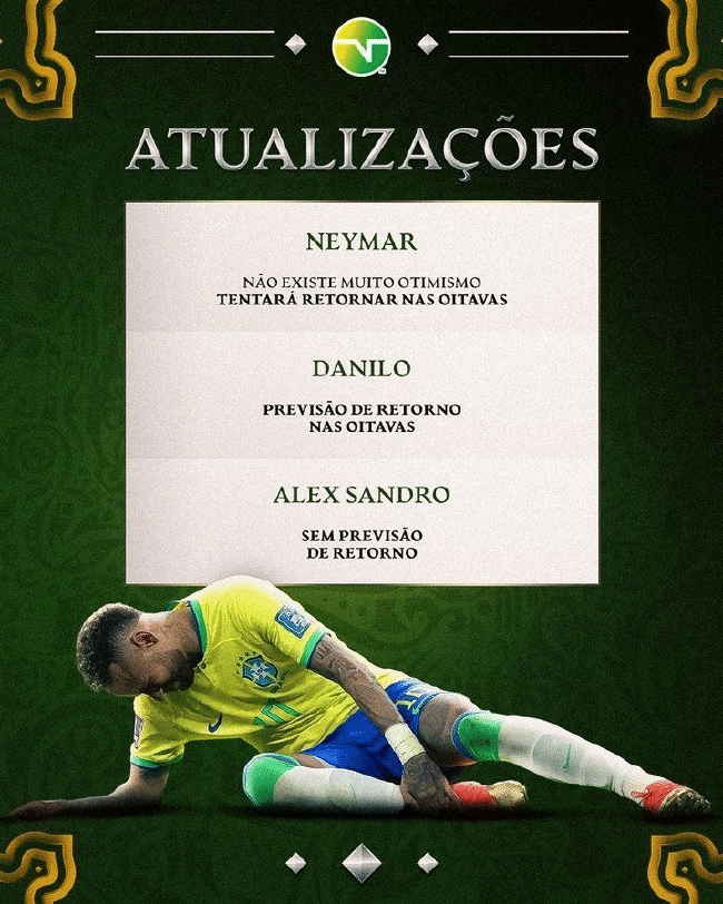 在巴西vs塞尔维亚的比赛中,第79分钟内马尔因脚踝伤势被换下。巴西足协此前消息,内马尔右脚踝外侧韧带受伤,并伴有小骨肿胀。桑德罗则是在次轮对阵瑞士赛后检查出臀部肌肉受伤。