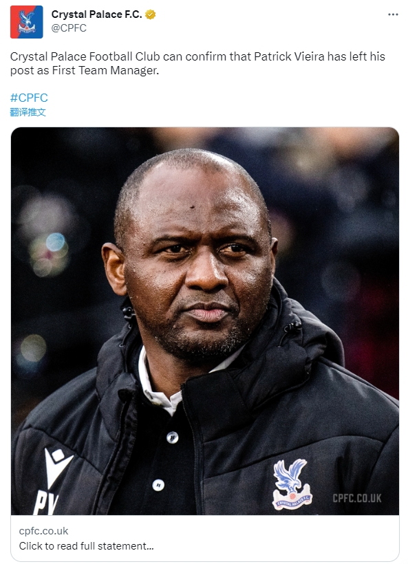 24直播网03月16日讯,官方消息,水晶宫主帅维埃拉下课。