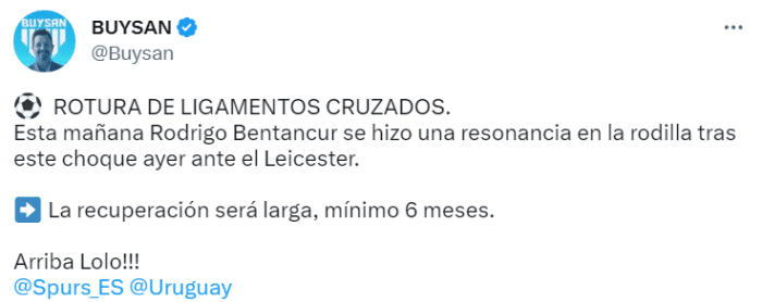 24直播网02月13日据乌拉圭记者Buysan报道,本坦库尔十字韧带撕裂,将至少伤缺6个月。